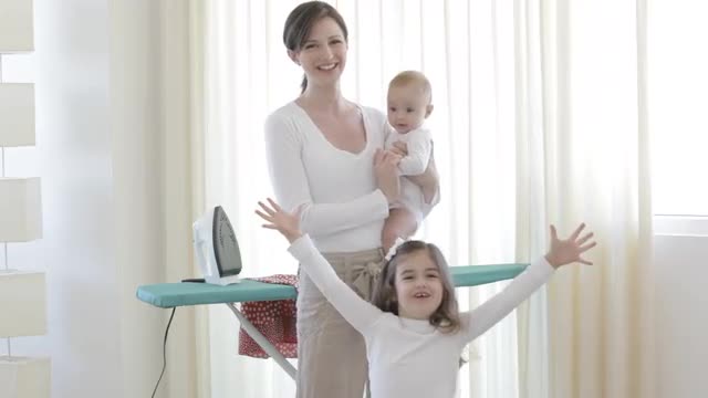 > Caucasian mother with baby and little girl and carriage