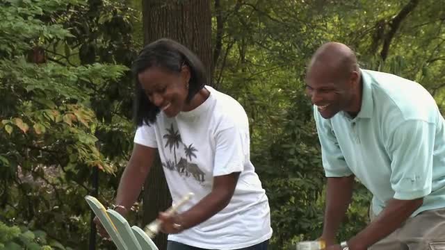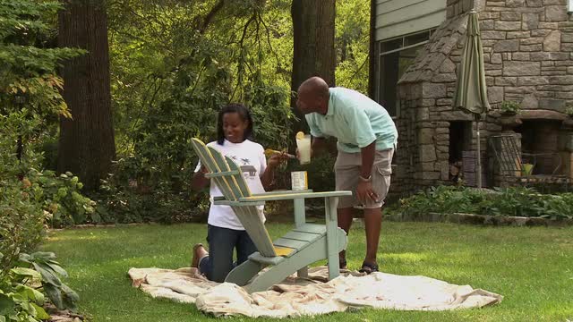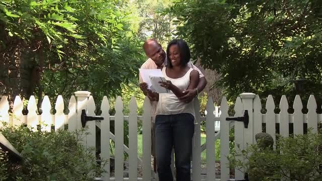 Black woman reading magazine in yard, husband approaching
