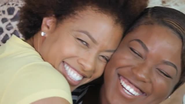 > African American mother and daughter hugging