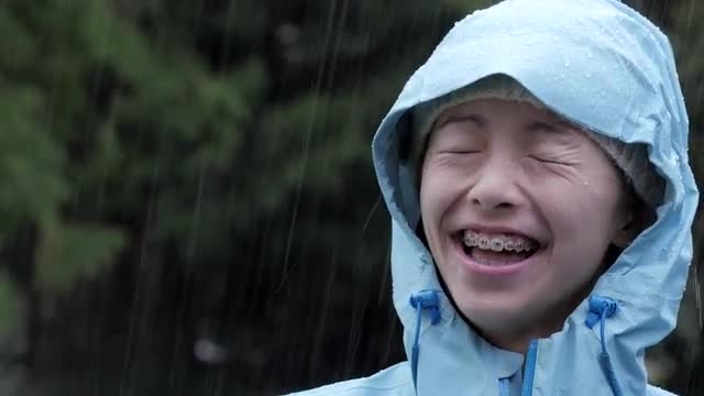 621380 - Mixed race girl catching rain on tongue in storm outdoors