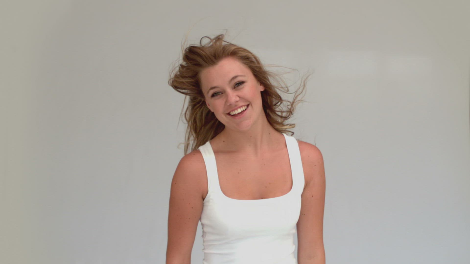 Caucasian blonde woman in studio smiling and laughing at camera