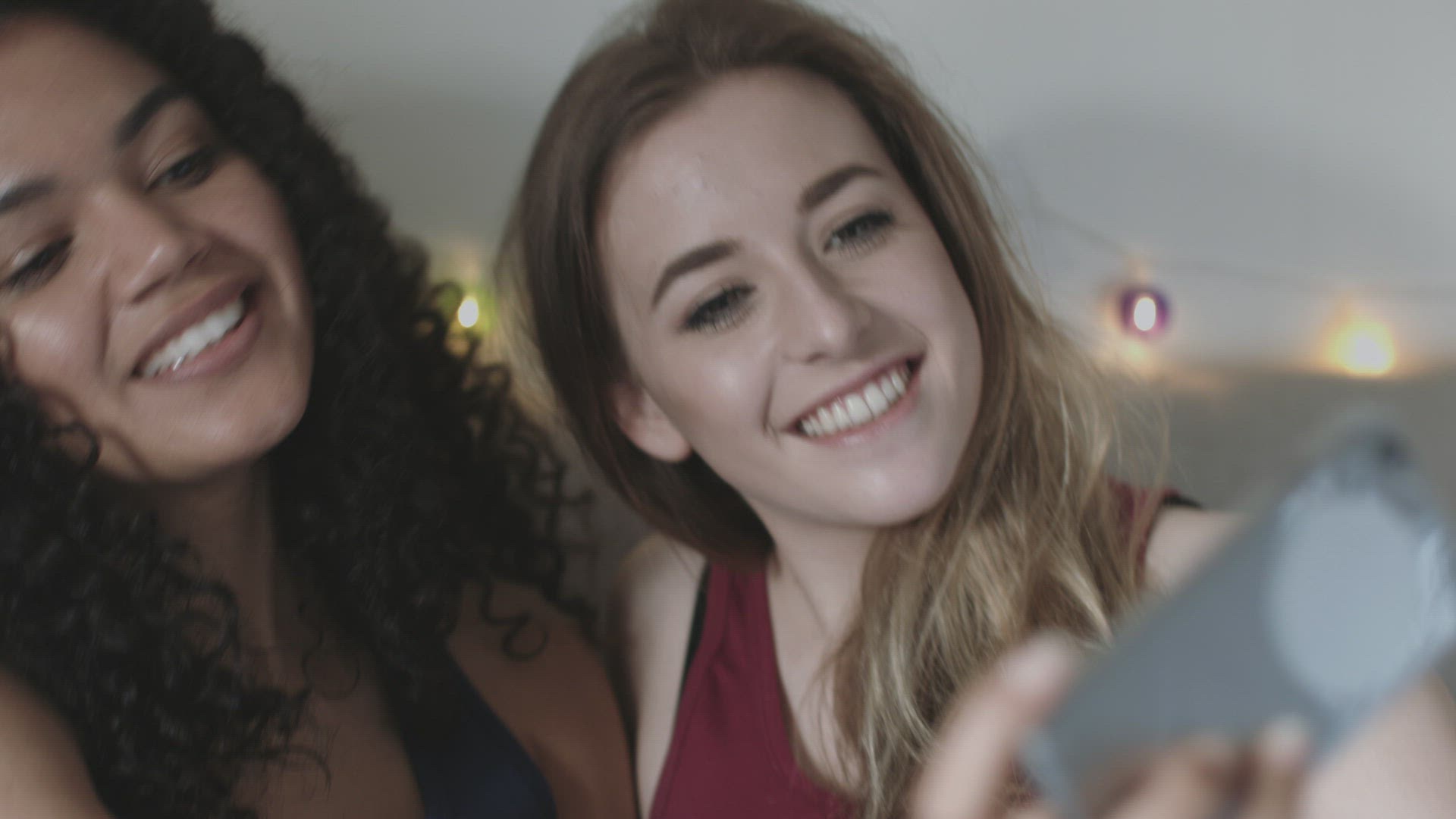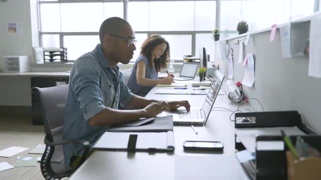 232329 - Black woman with travel coffee mug leaning over bed to type on laptop