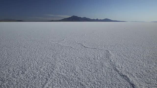 345951 - Flying forward from the gravel edge of rest stop out over the salt flats with mountains in the backg