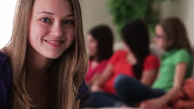 232834 - Girl smiling at camera with friends on sofa in background