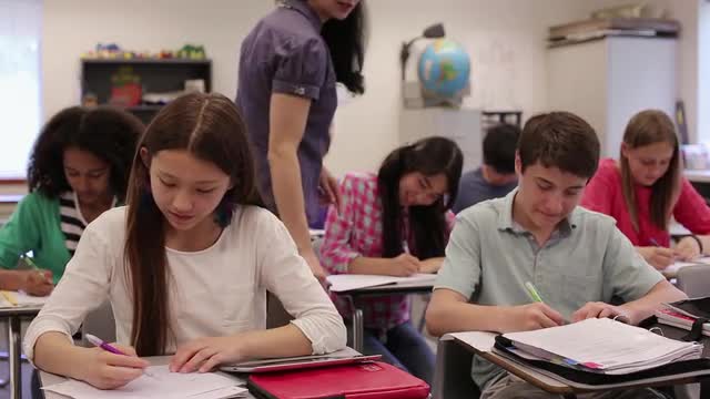 233104 - Caucasian junior high students studying in library