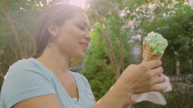 > Smiling Hispanic woman eating waffle ice cream cone