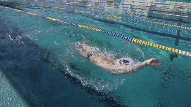 Slow Motion Of Professional Male Swimmer Swimming Backstroke In Lap Pool