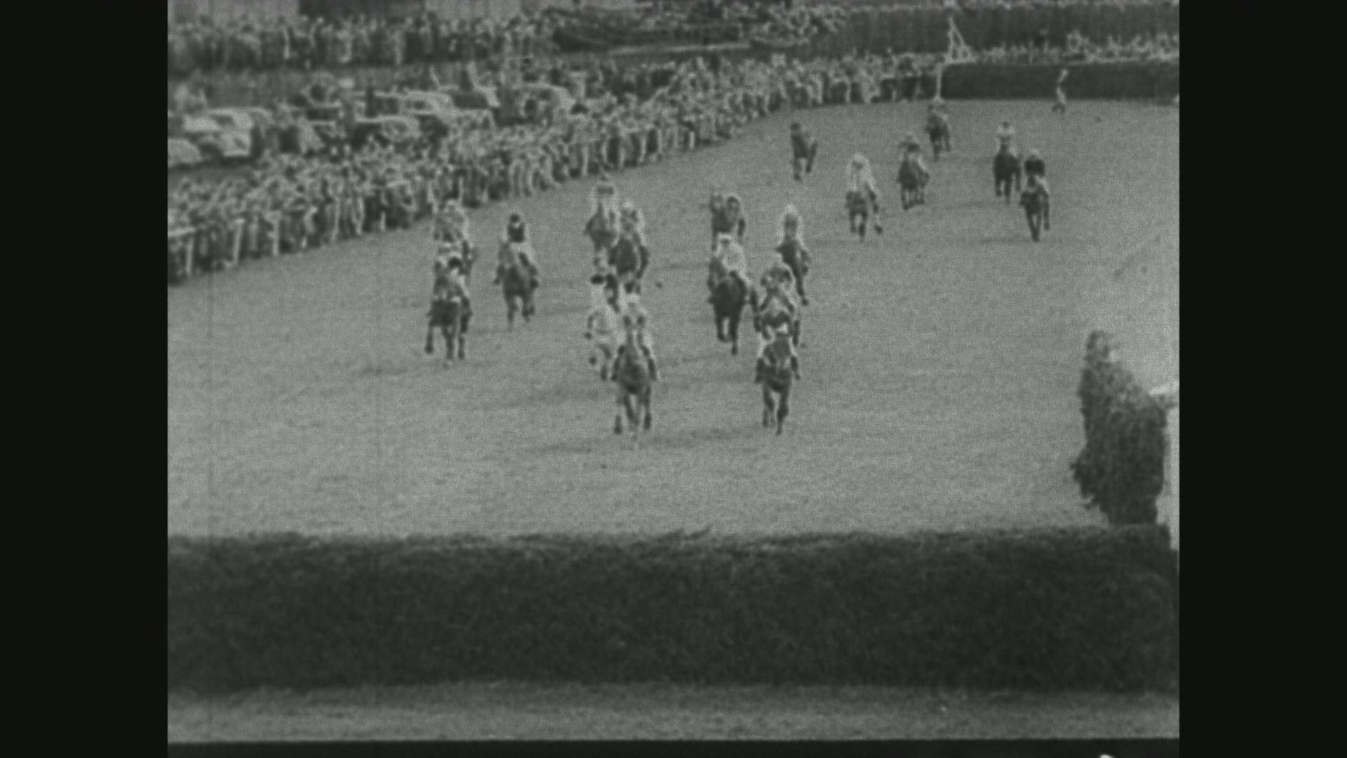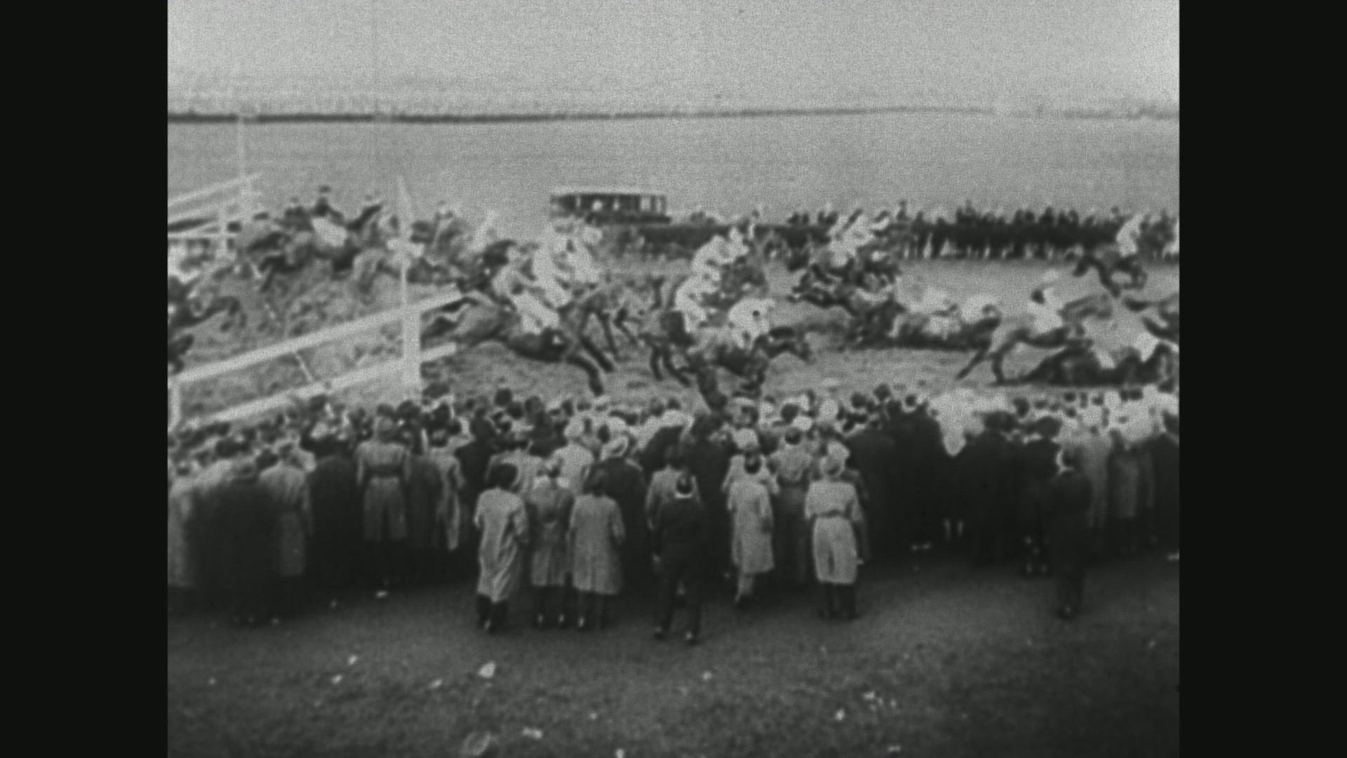 audience standing in stadium seats to watch horse race