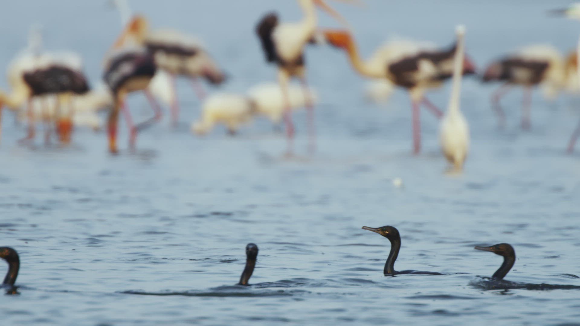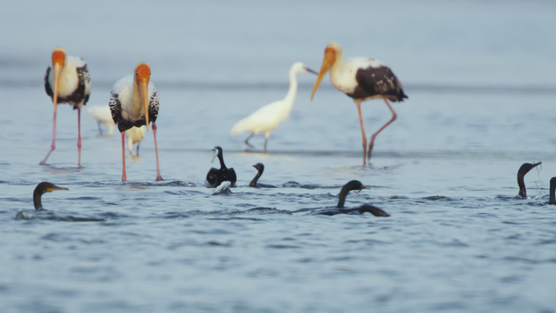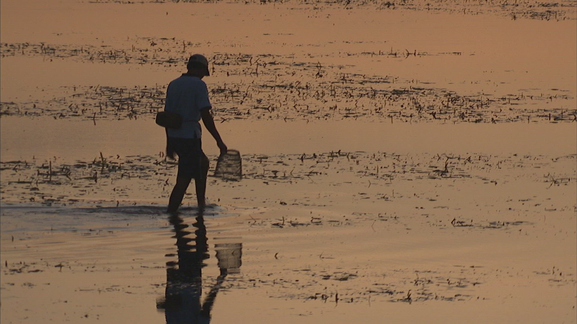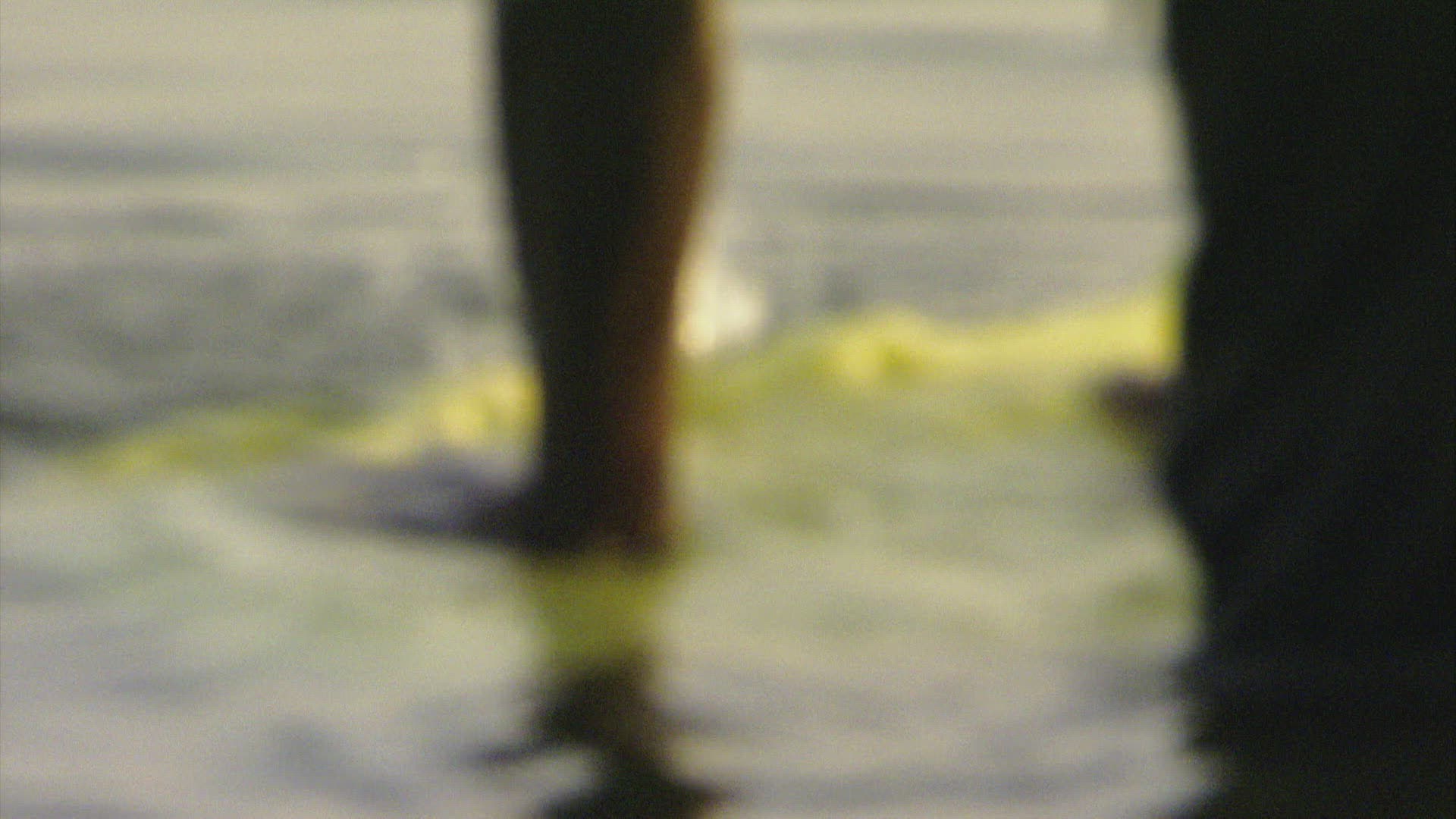> Medium shot of silhouette of man wading in water with board under red fire sunset sky
