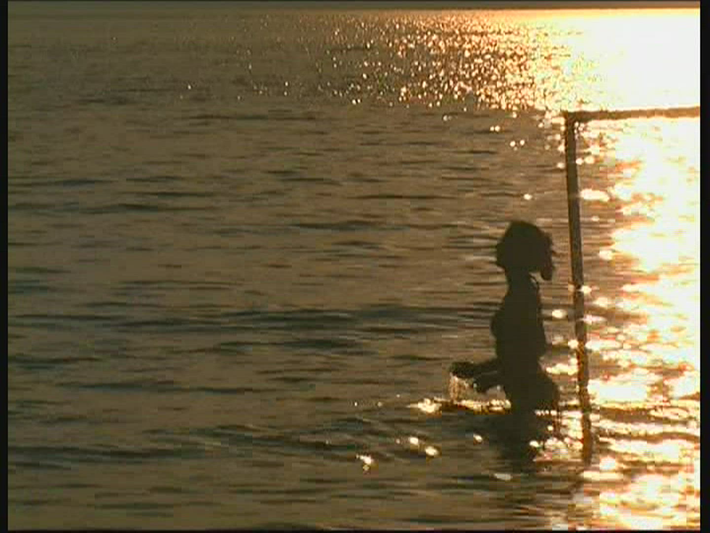 > Ocean water surface with red ball of sunset casting light in singular ray at dusk