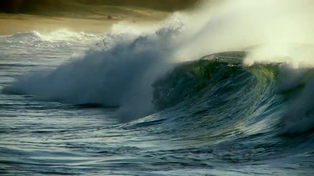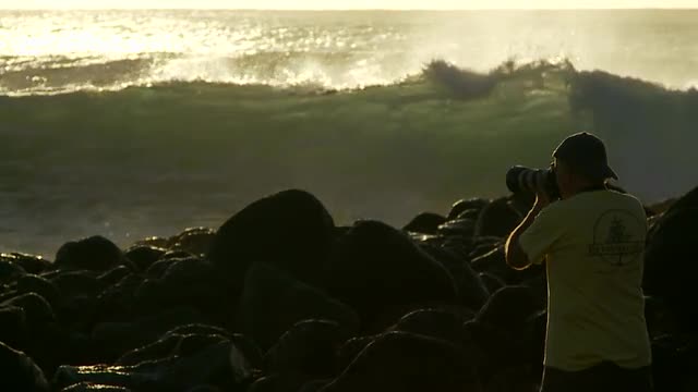> Surf photographer turns as wave crashes glistening green in crystal clear water