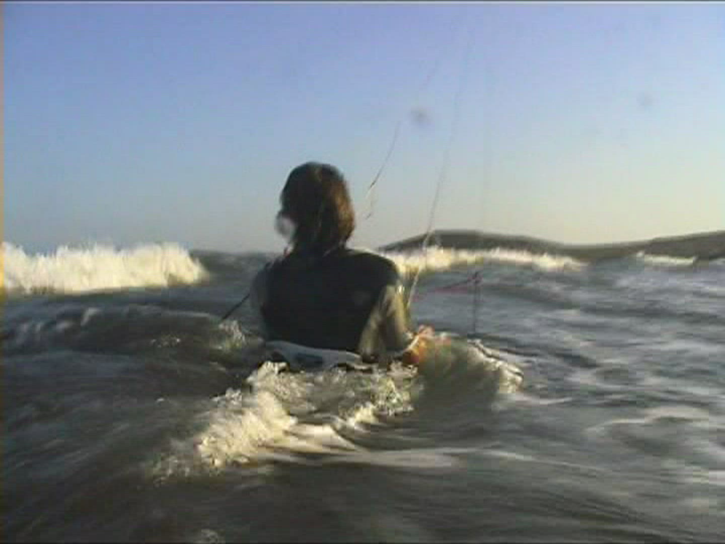 > Shorebreak surf photographer films surfers at sunrise, light glistens on water