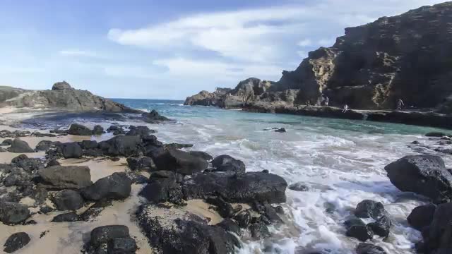 2266790 - Ocean water spray and mist blows over top of wave on stormy day, slow motion in water
