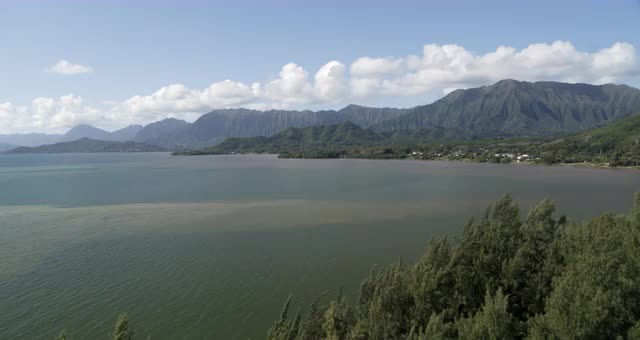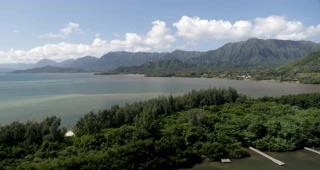 1119961 - Aerial view of the ocean, trees and mountains in Kualoa, Oahu