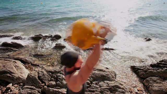 Man with kettlebells exercising on the beach.