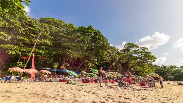 > Small island surrounded by sandy beach with dense coconut palm jungle in middle