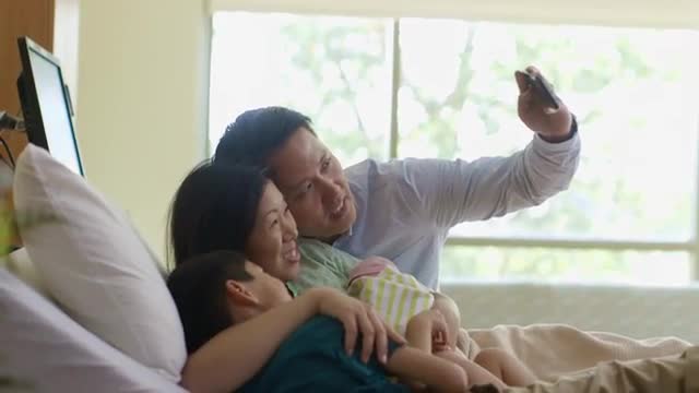 650218 - Family posing for selfie in hospital room with newborn baby