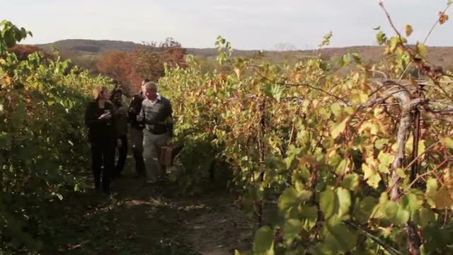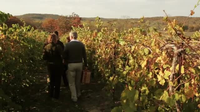 > Silhouette of caucasian family walking between crops at dusk