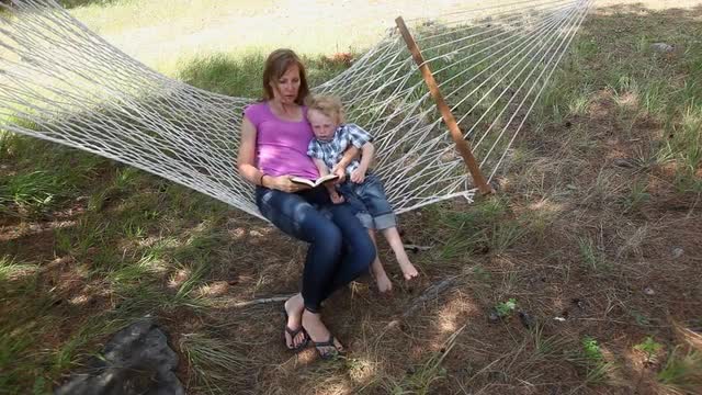 530335 - Mother and son reading in hammock