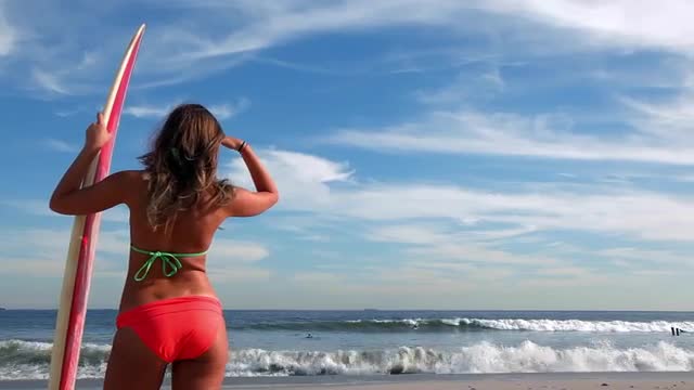 > Woman holding surfboard on beach