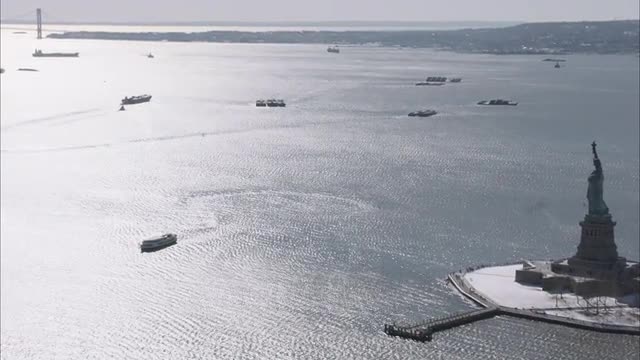 > AERIAL WIDE view of the Statue of Liberty with ferries on the water