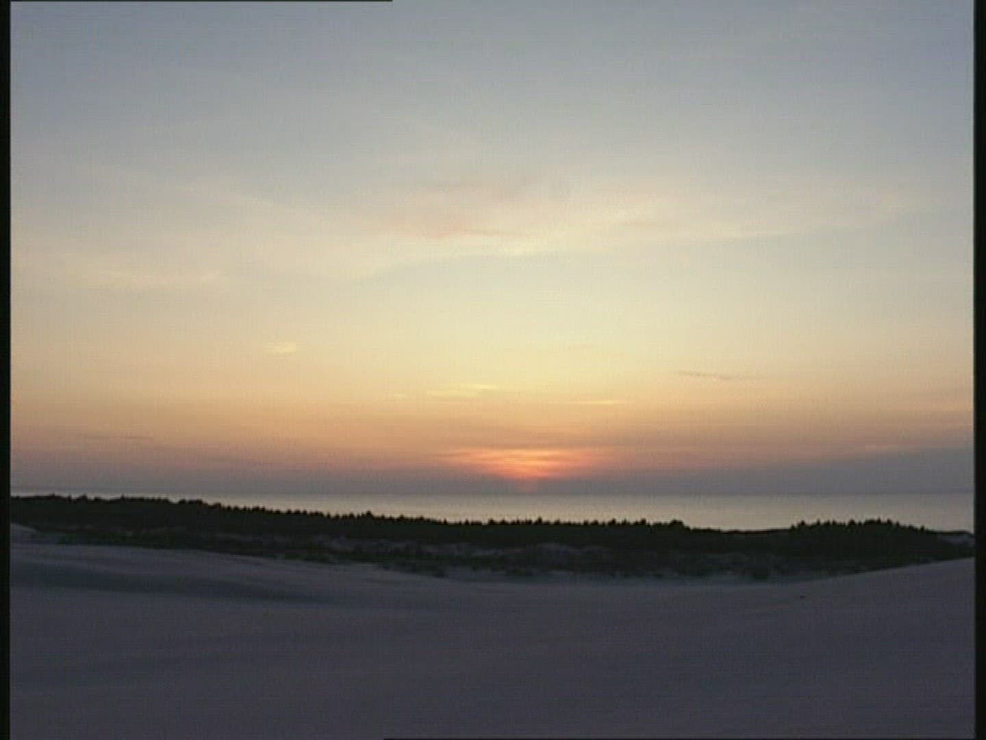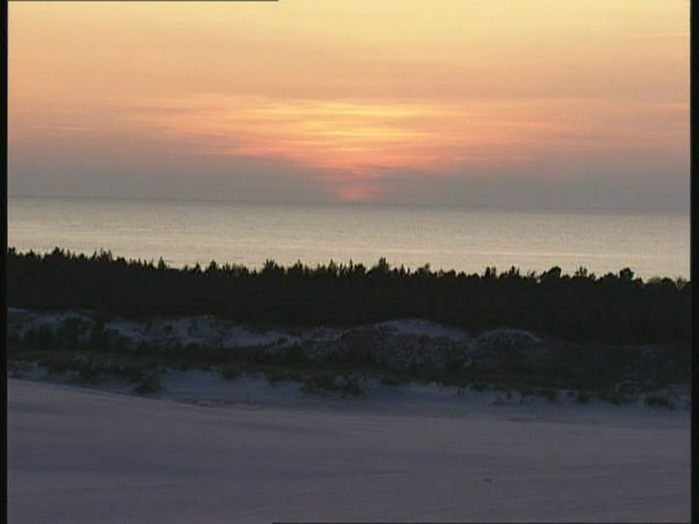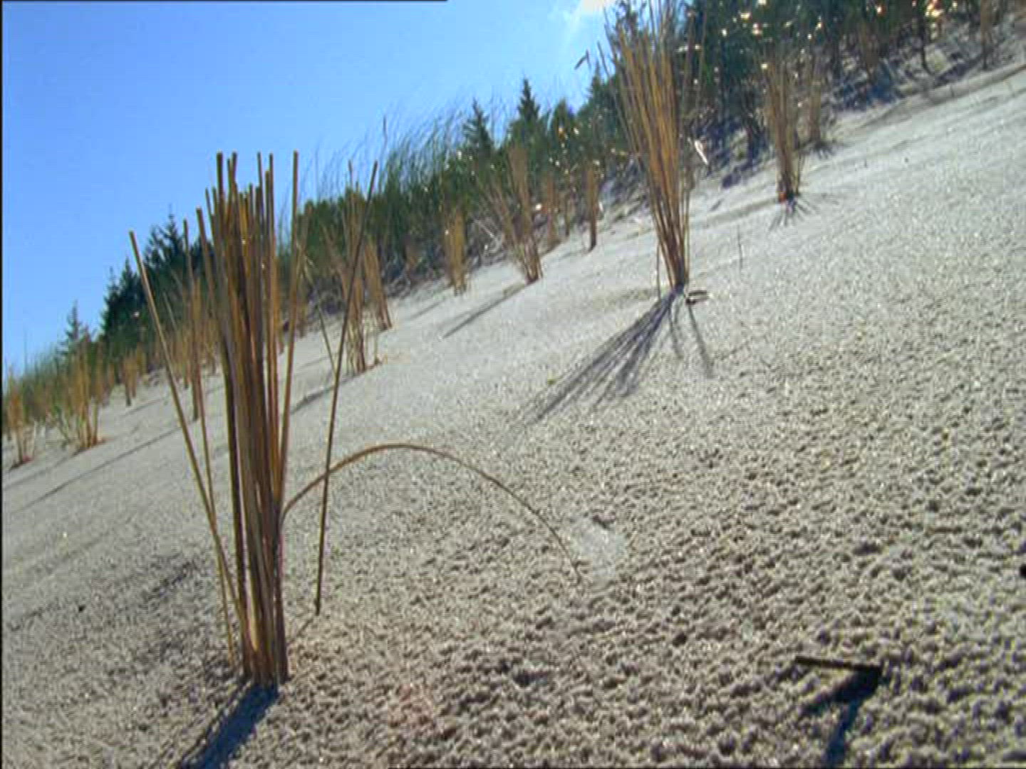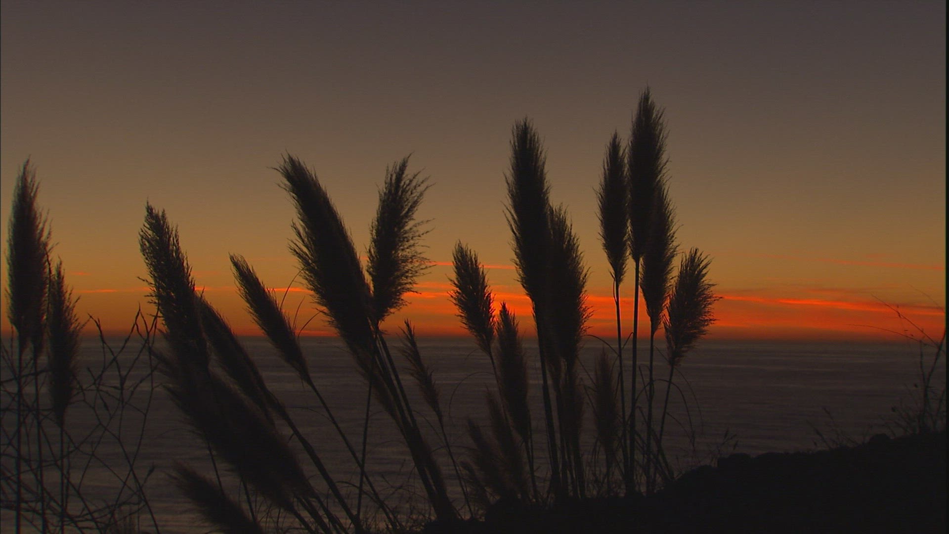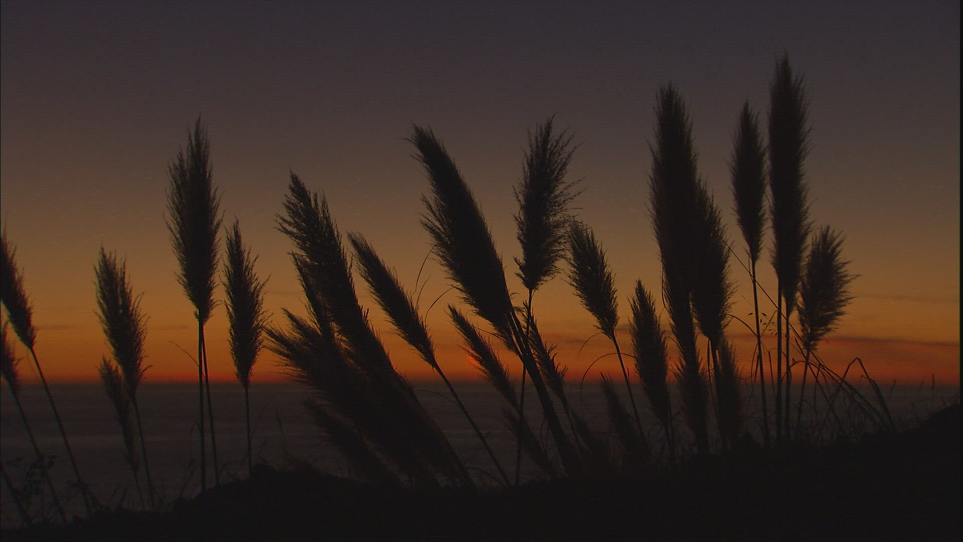 Late afternoon on the beach. Shore grasses blow in the breeze showing the colors of the setting sun.