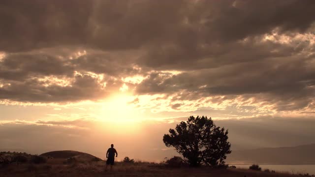 1002683 - Person jogging to hilltop raising arms