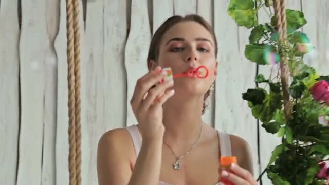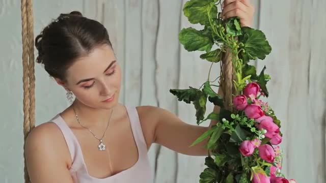 Beautiful Retro Fashion Model With Headscarf Poses On Swing In Garden
