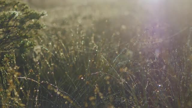 Close up of marsh grass stems covered in morning dew swaying slowly in the wind during a summer sunrise in wetlands.