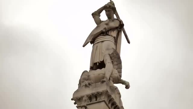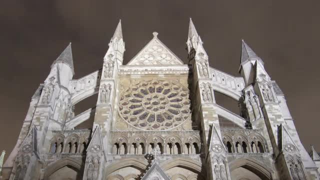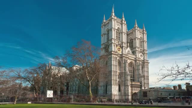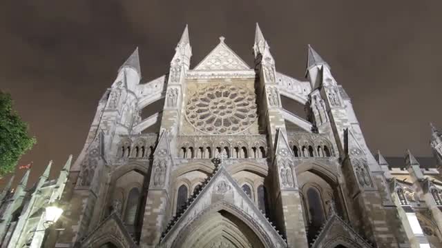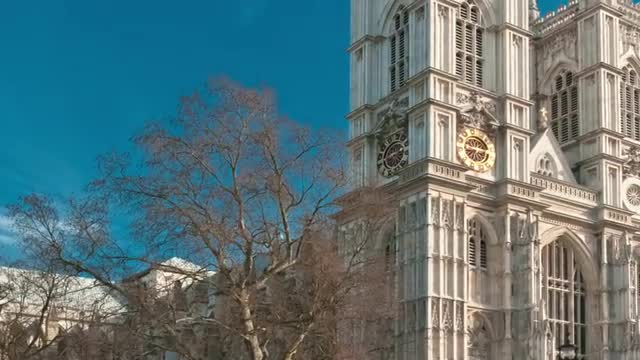 A view of the outside of London's Westminster Abbey, beside the Houses of Parliament on Parliament Square, London.