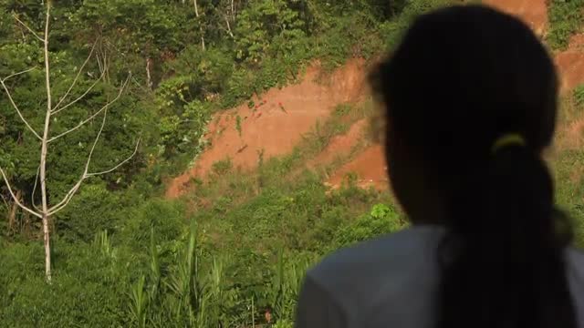 805353 - Girl standing at rainforest viewpoint, crane pan reveal through vegetation, wide high speed 240