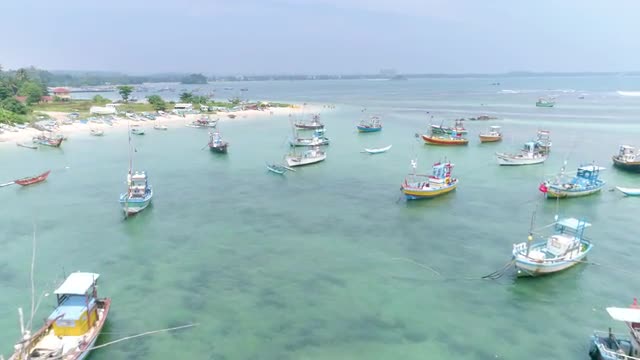 Drone orbits above support boats and surfer lineup crowd at Cloudbreak Fiji