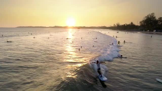 > Drone orbits above support boats and surfer lineup crowd at Cloudbreak Fiji