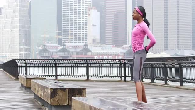 244596 - A woman stretches before a run in Brooklyn, next to the bridge