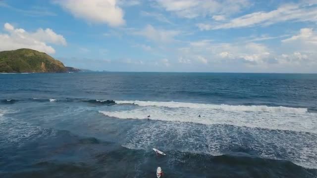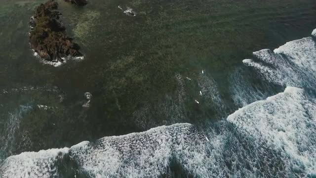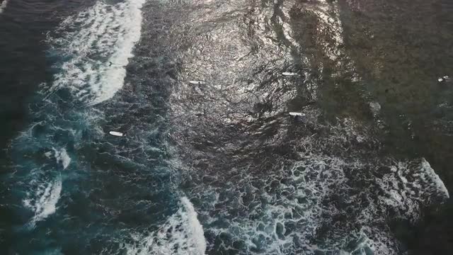 > Drone top down aerial of surfers waiting in lineup, white boards in dark ocean water