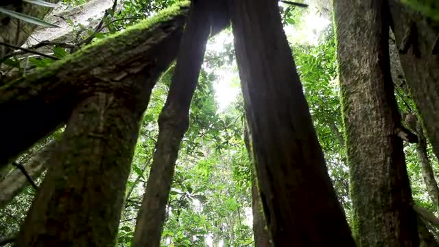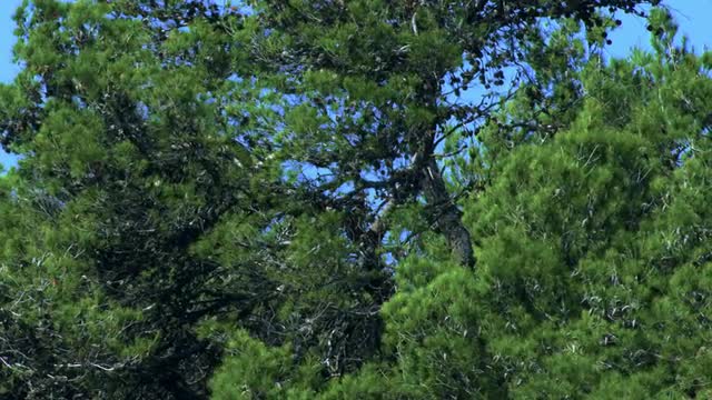 2180794 - interior forest with trees in strong winds - pine trrees - low view - white clouds moving fast