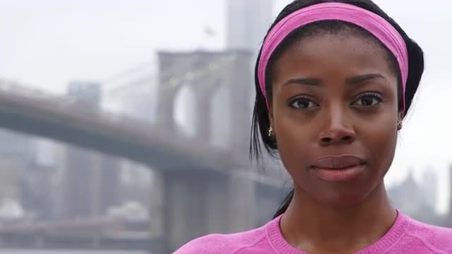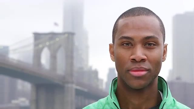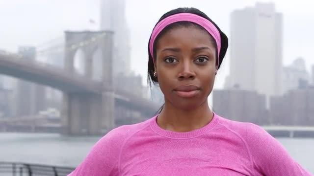 Close up of a man in running gear looking into the camera on an overcast day while standing in front of the brooklyn bridge