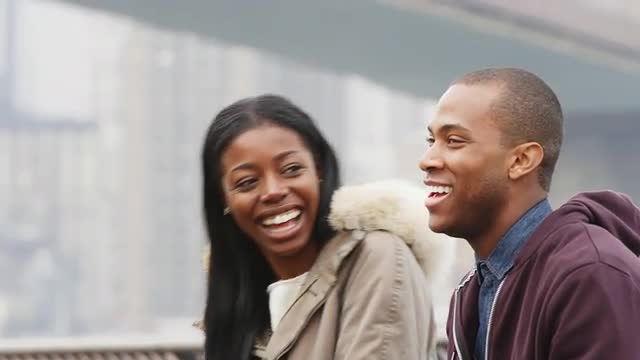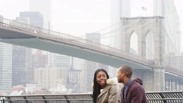 A man and woman stand in front of brick wall with graffiti holding hands, and look into the camera, then turn and stare at each other