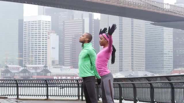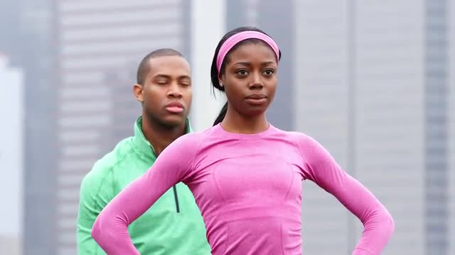 A couple holds hands and walks towards the camera in a park, in slow motion