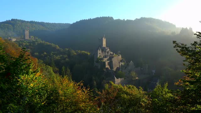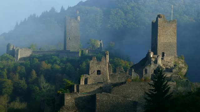 Vibrant time-lapse of ruins within nature; Trees, clouds and a taste of sunlight