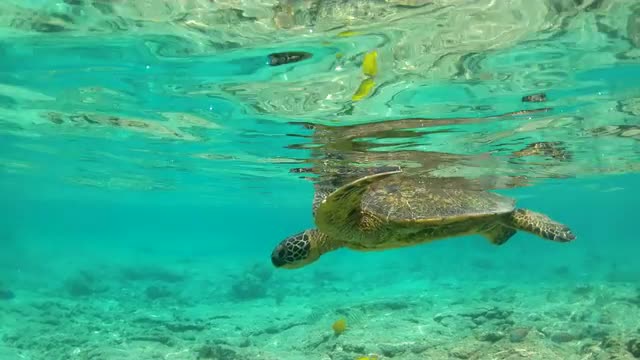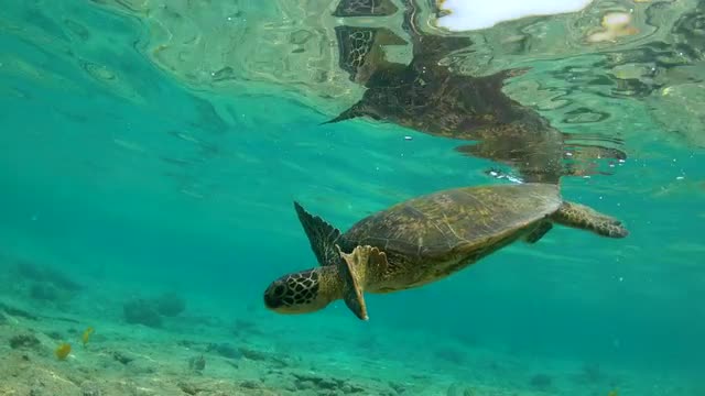 Slow motion underwater POV from a shark cage as sunlight sparkles and trevally silhouettes swim