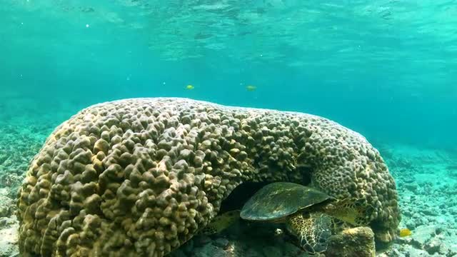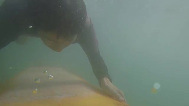 > Slow motion underwater POV from a shark cage as sunlight sparkles and trevally silhouettes swim