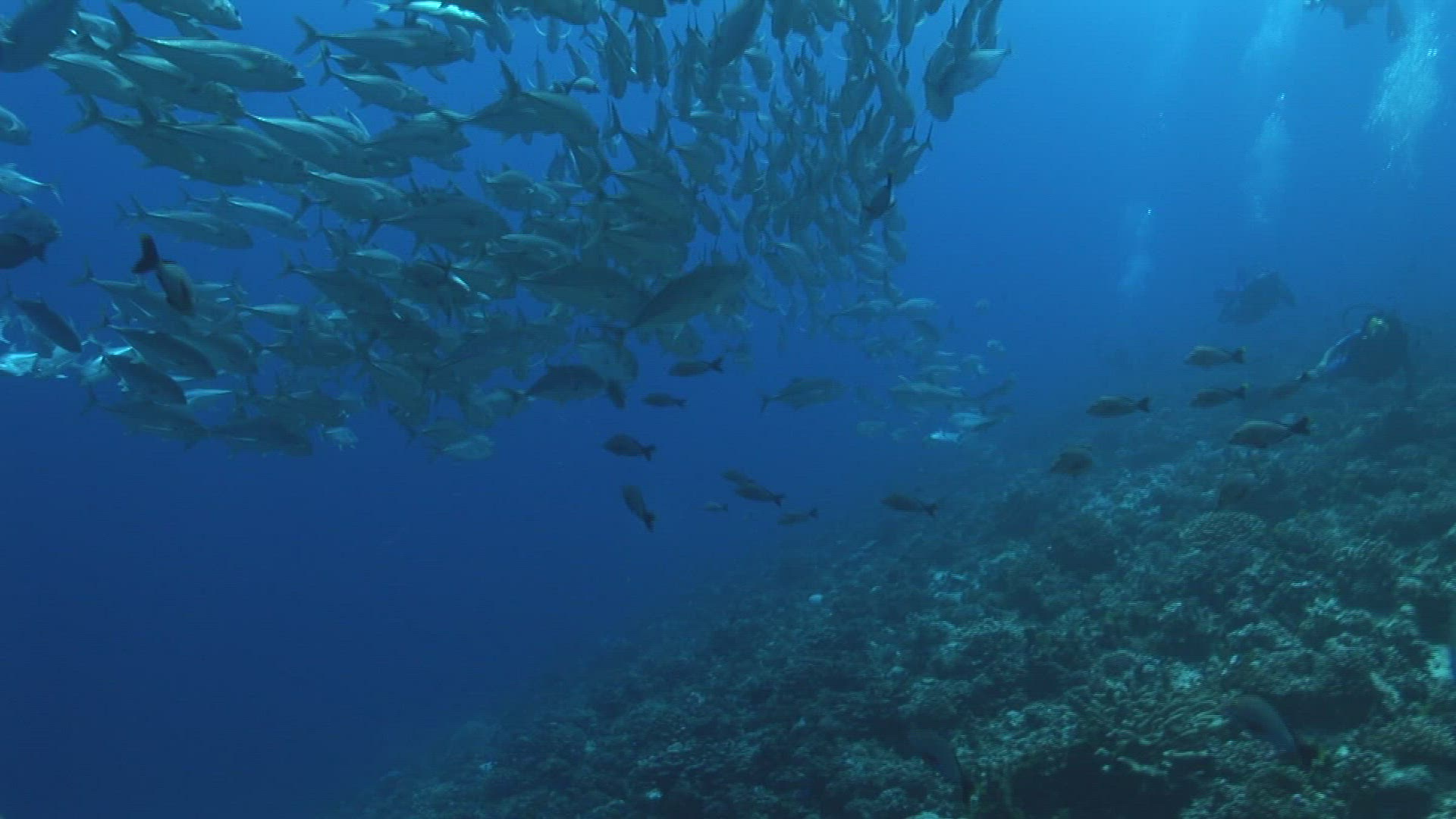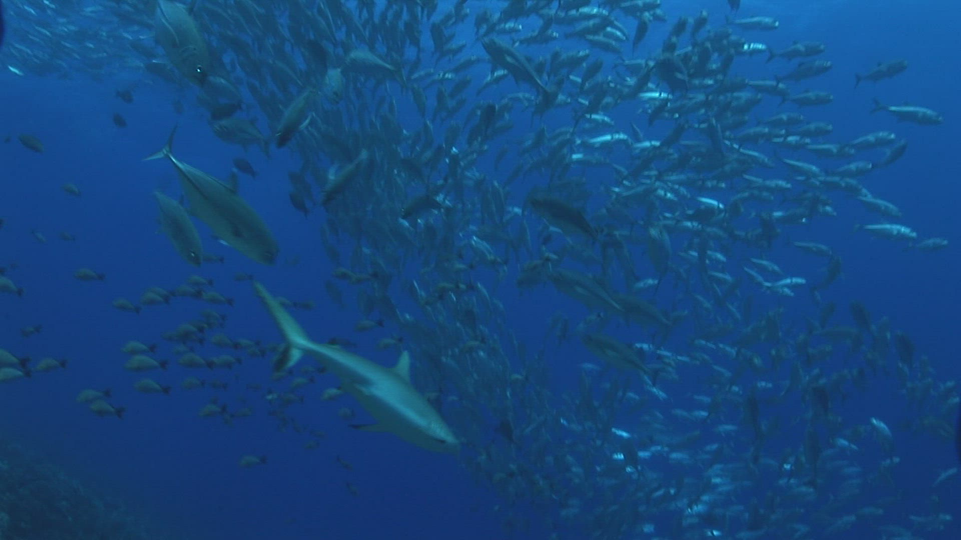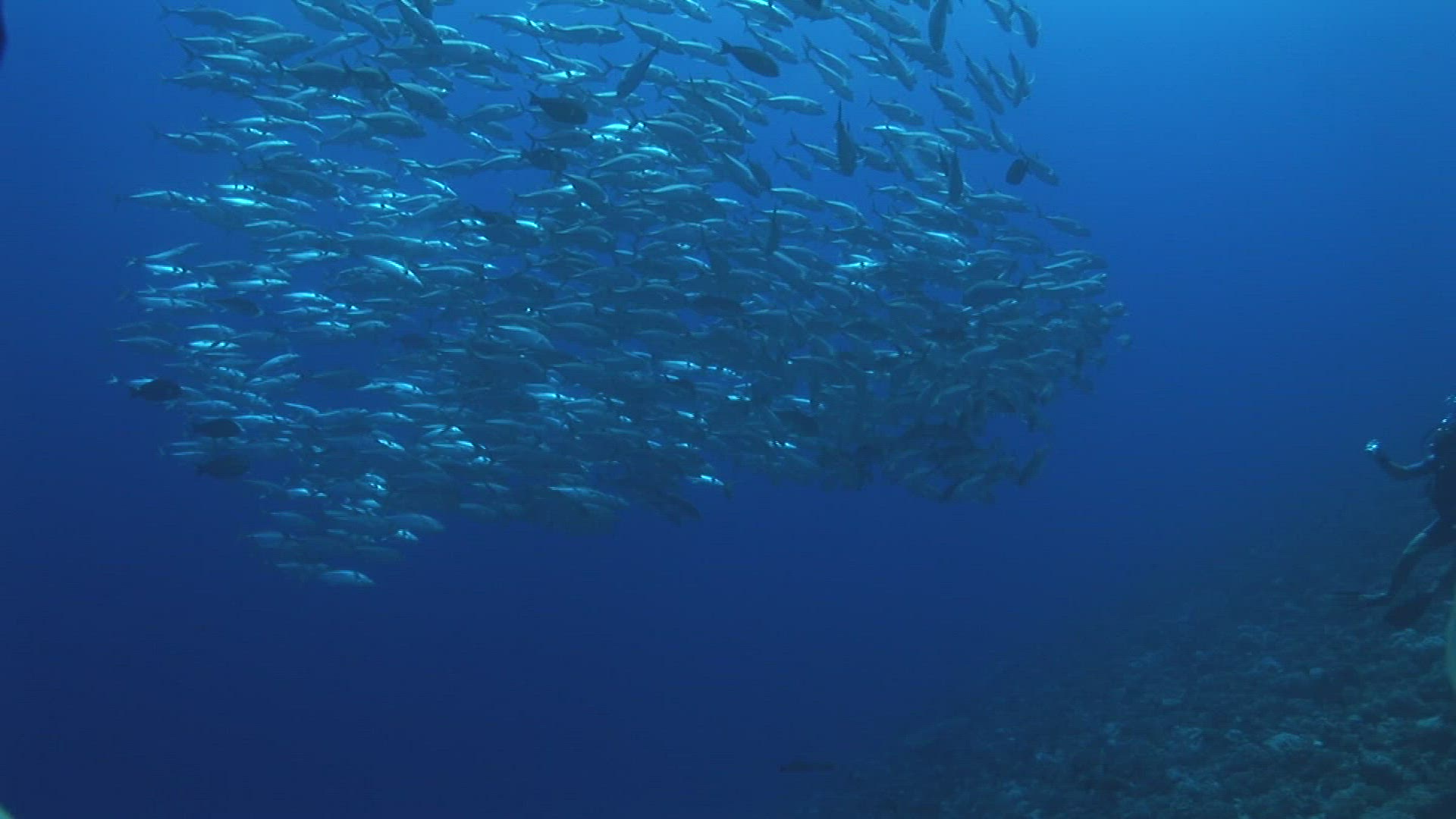 > Schooling fish flow gently around underwater shark cage in deep blue ocean, slow motion