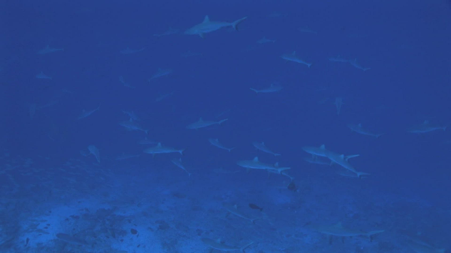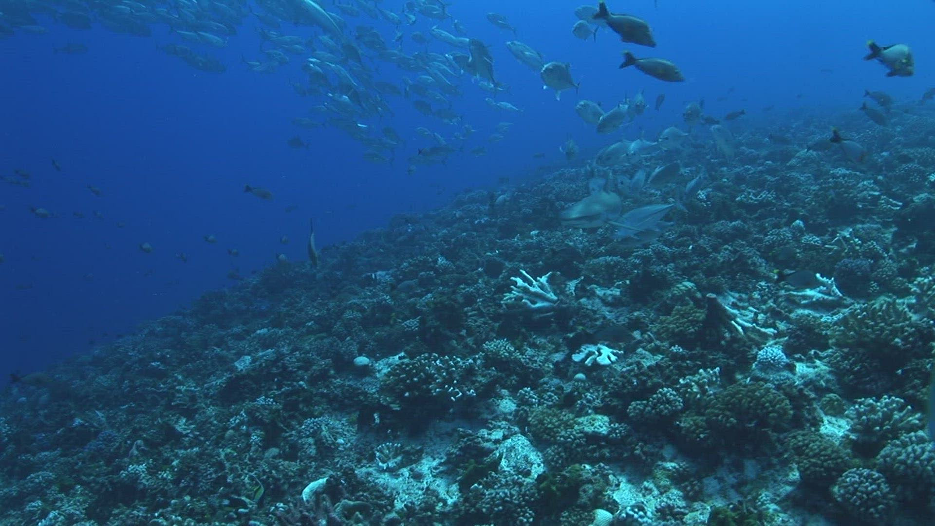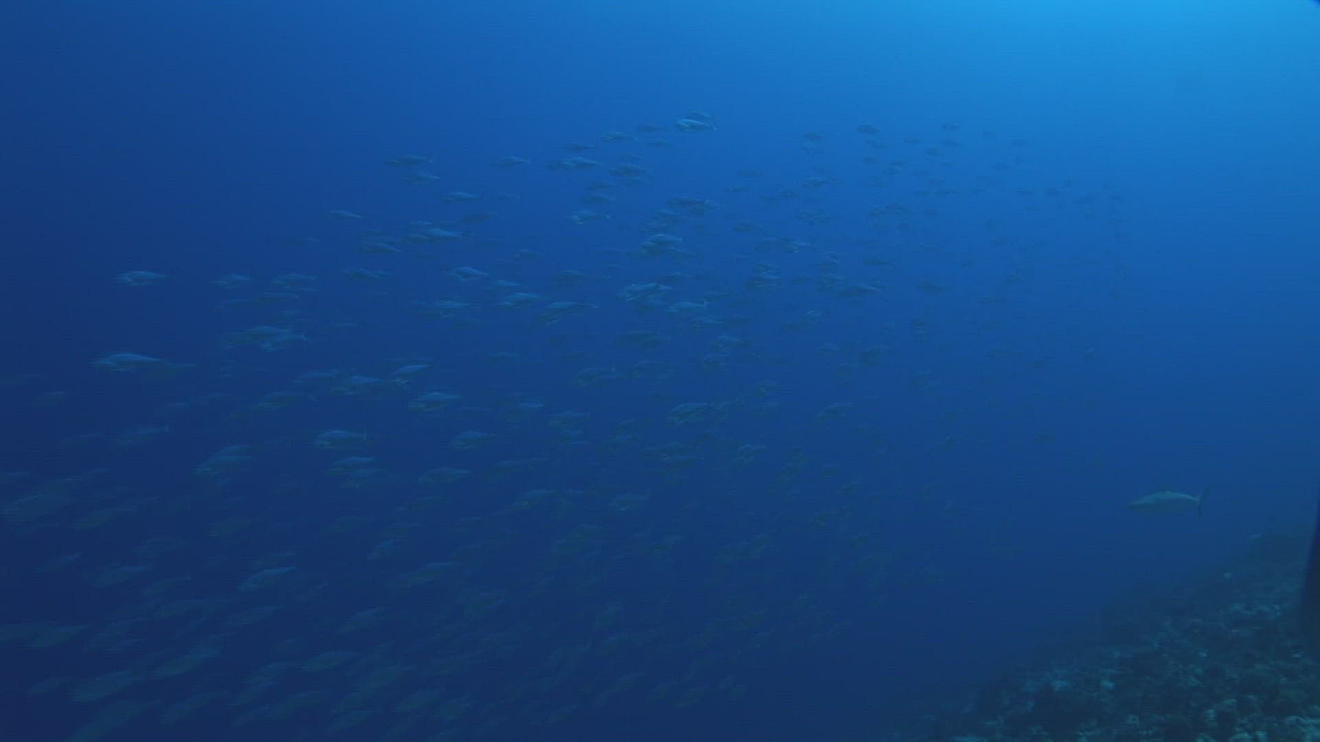 > Schooling fish flow gently around underwater shark cage in deep blue ocean, slow motion