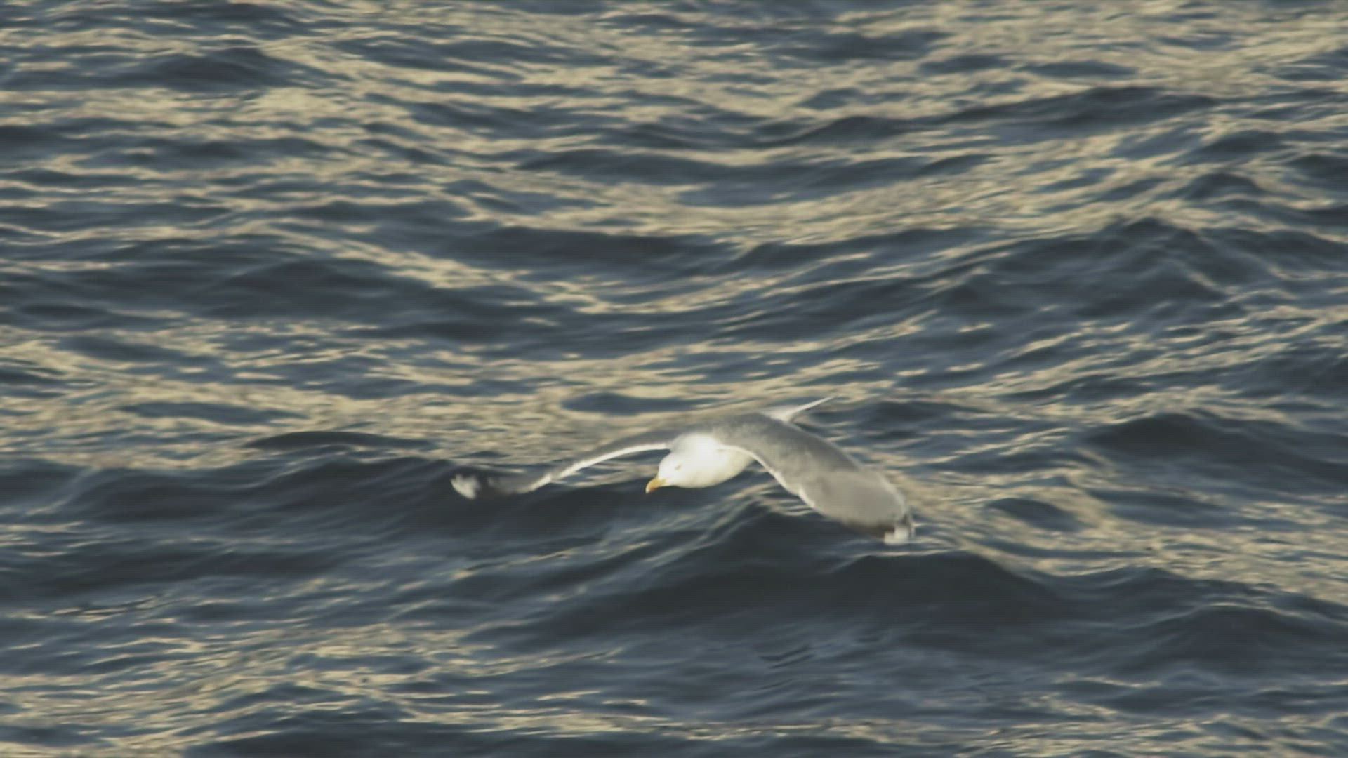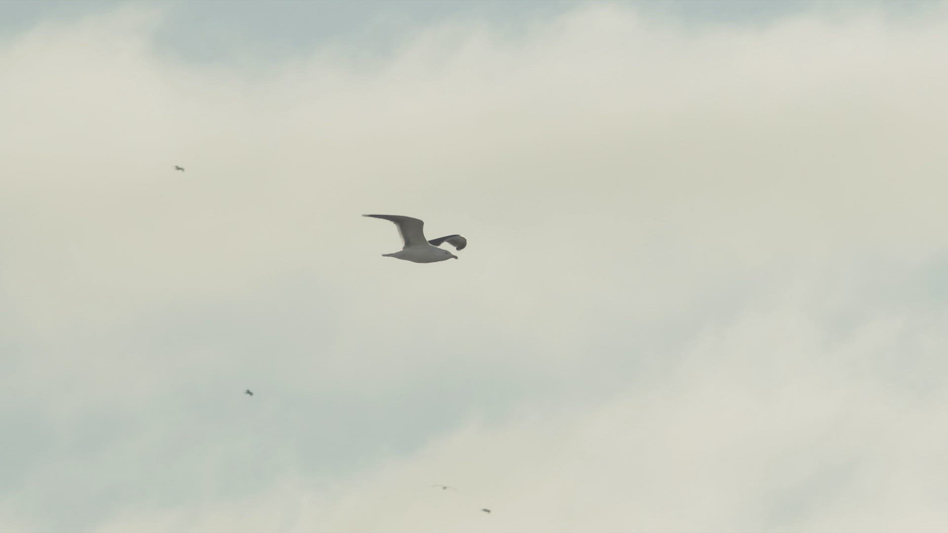 Group of seabirds flying chaotically over sea, captured in slowed cinematic motion