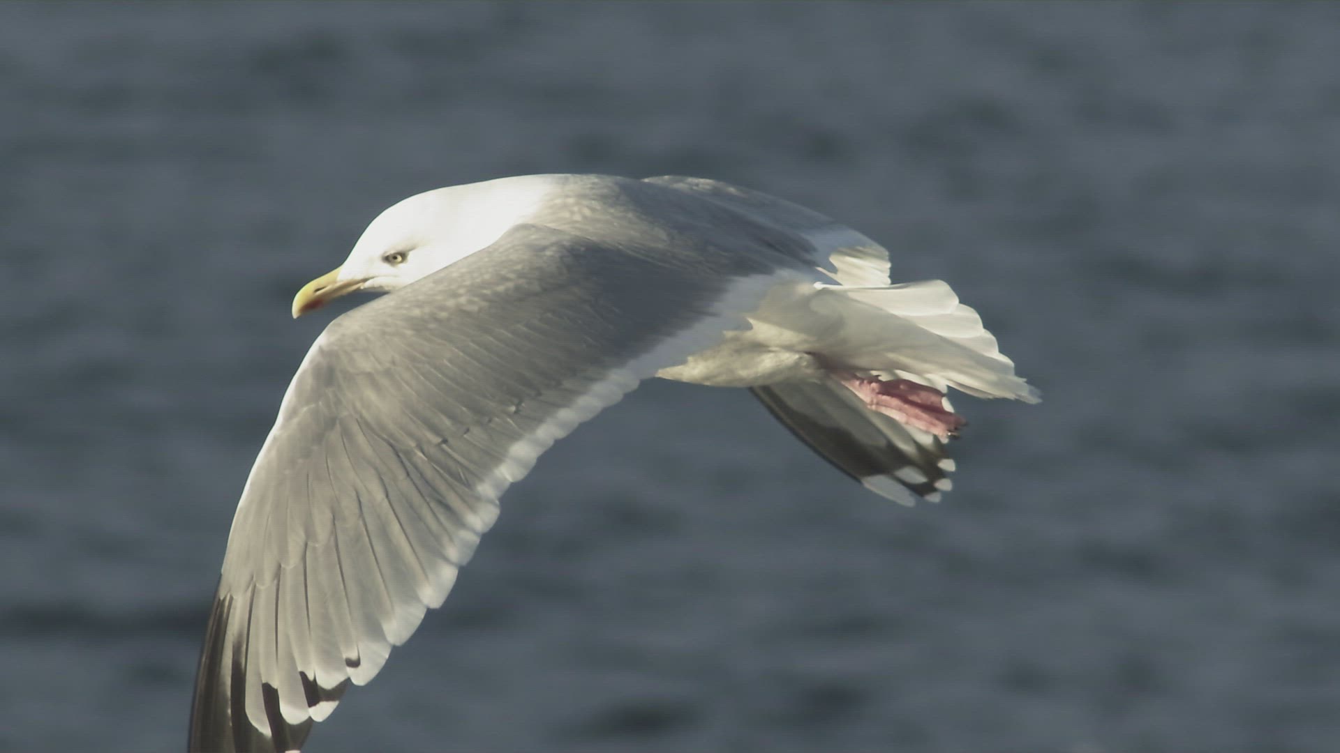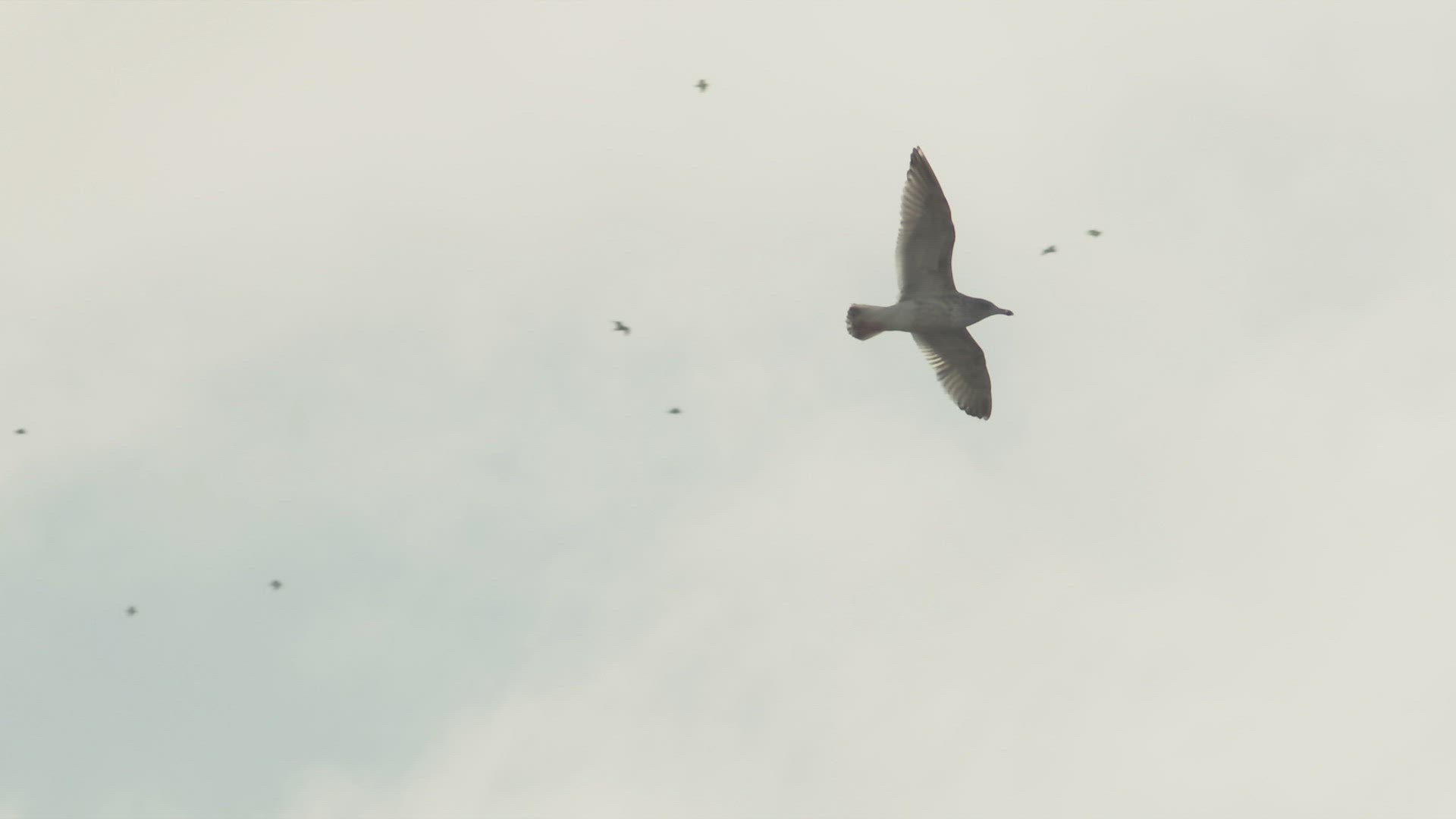 > Group of seabirds flying chaotically over sea, captured in slowed cinematic motion