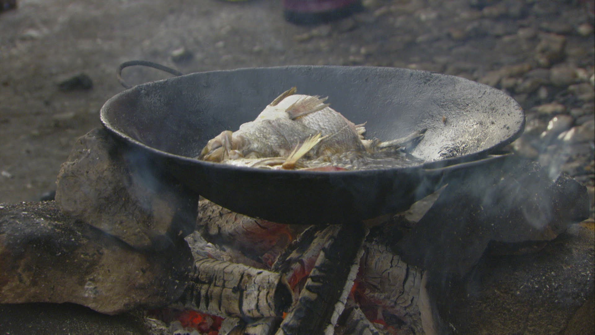 1085488 - Cooking outdoors in iron cauldron.