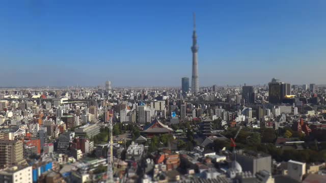 958855 - Timelapse bird's eye tilt-shift shot of Sensoji temple at sunset, Tokyo, Japan