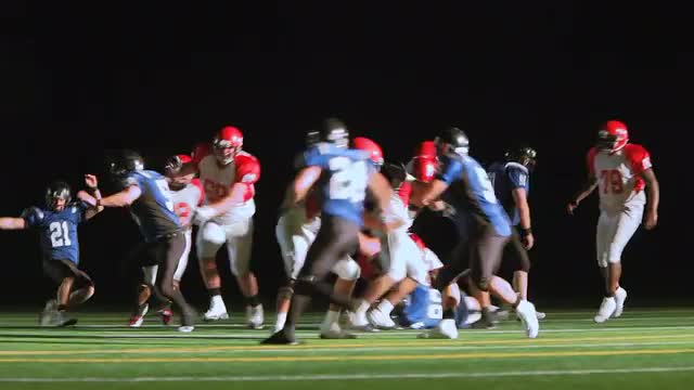 > Football players react to a hand off