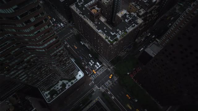 Sunrise over the city. Time lapse. High angle. Aerial view. The roofs of the houses lit by soft warm light